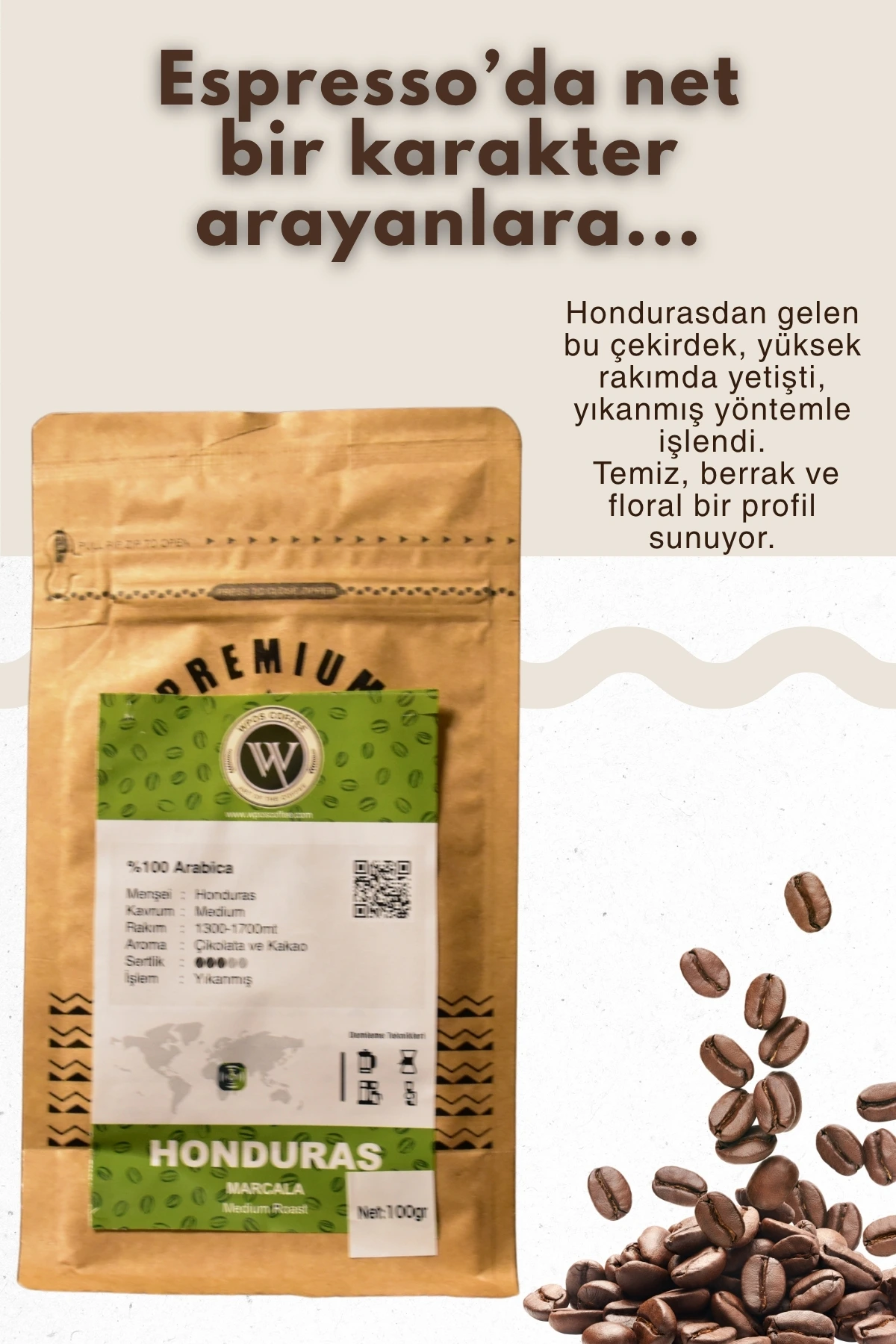 Bilgilendirme:%100 Arabica çekirdeklerden üretilmiştir. Menşei Honduras’tır. Orta kavrulmuştur. 1300–1700 metre rakımda yetişmiştir. Çikolata ve kakao aroması içerir. Sertlik seviyesi 4/5’tir. Yıkanmış işlem uygulanmıştır. Net ağırlık: 100 g.